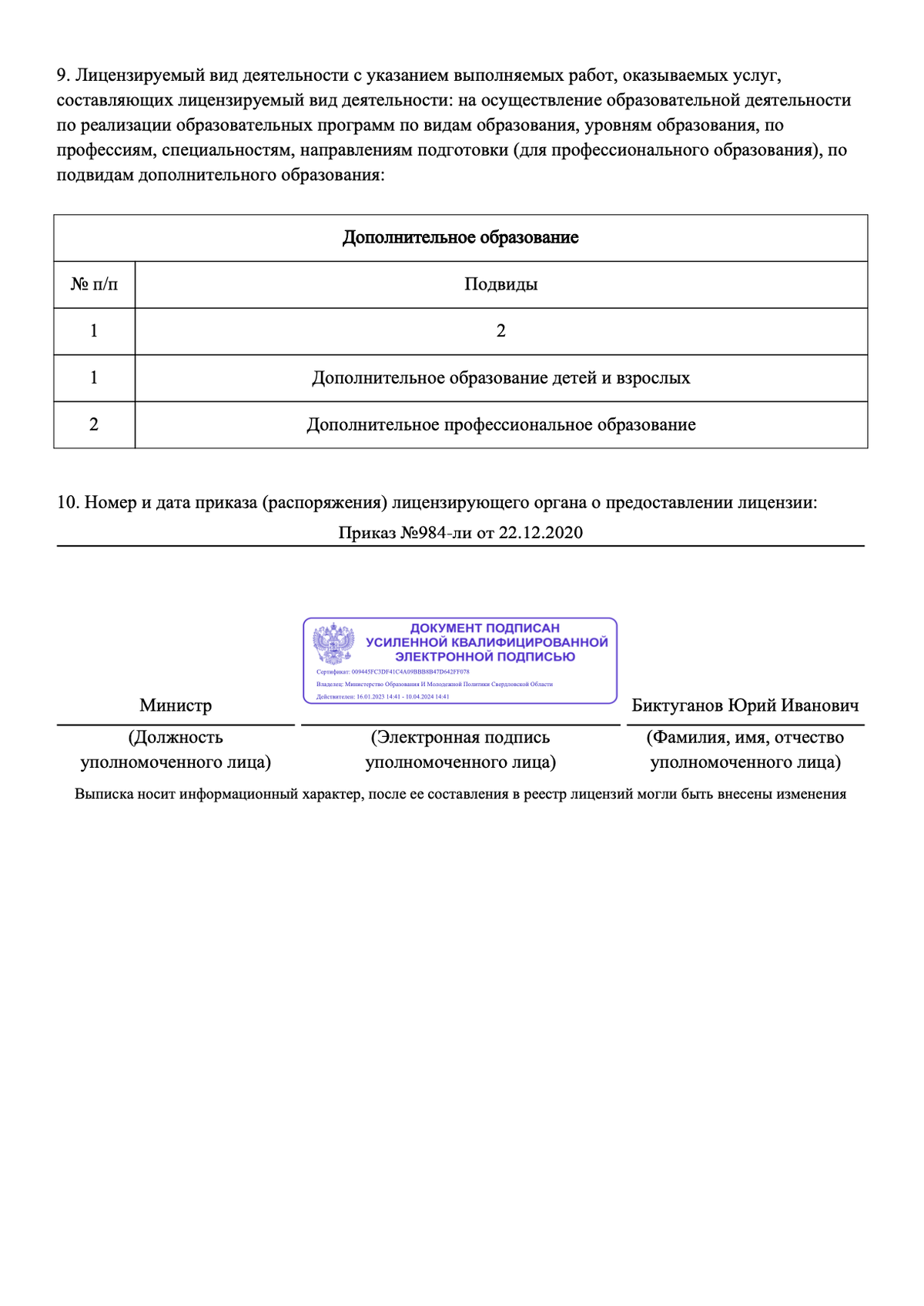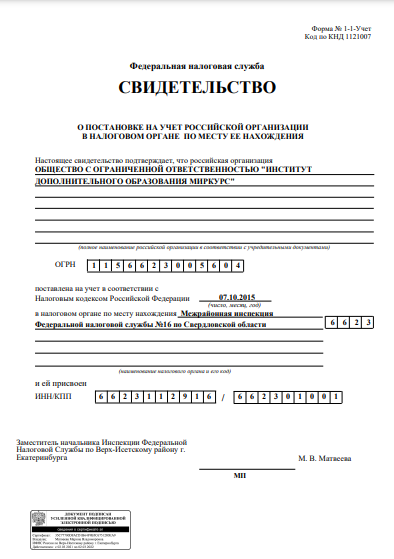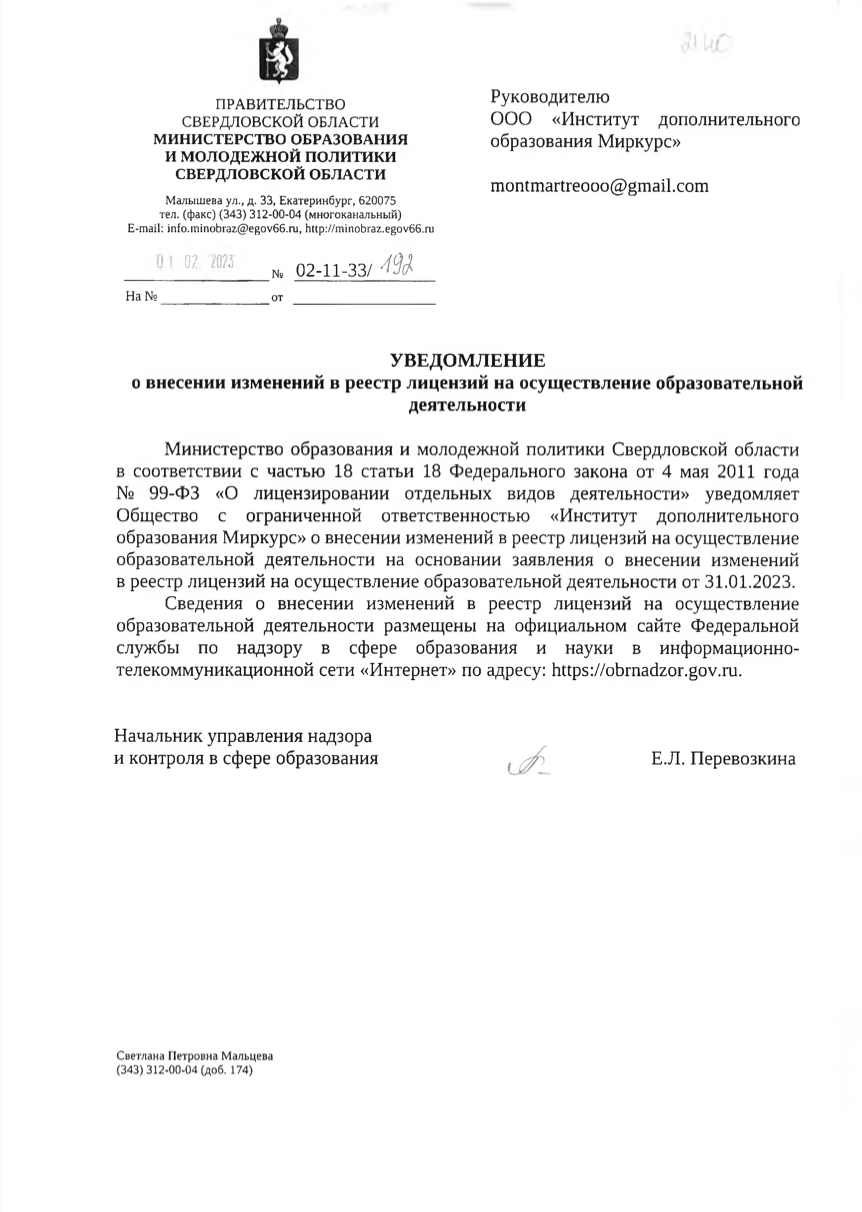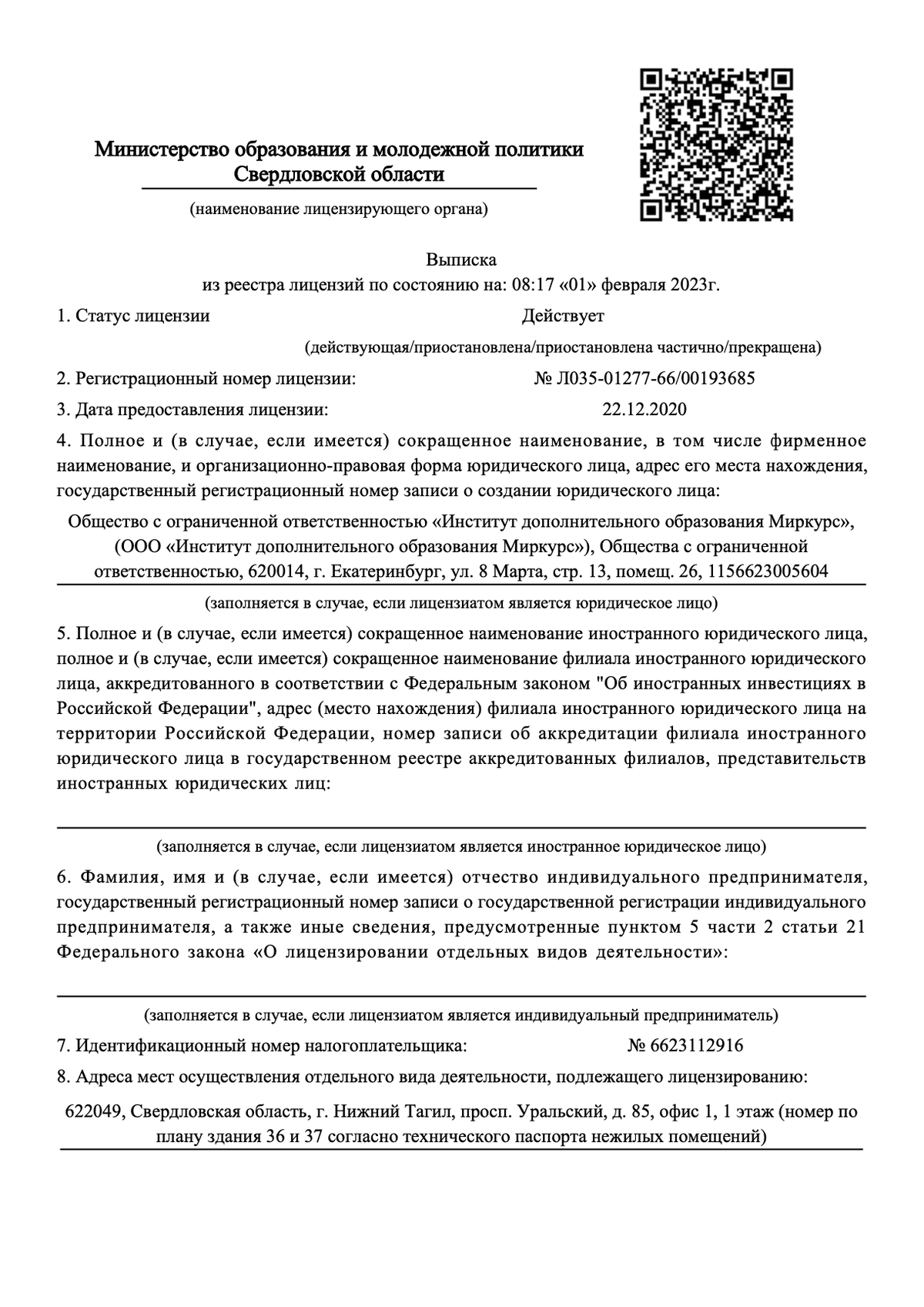 Действующий: № Л035-01277-66/00193685 от 22.12.2020 выдана Министерством образования и Молодежной политики по Свердловской области.