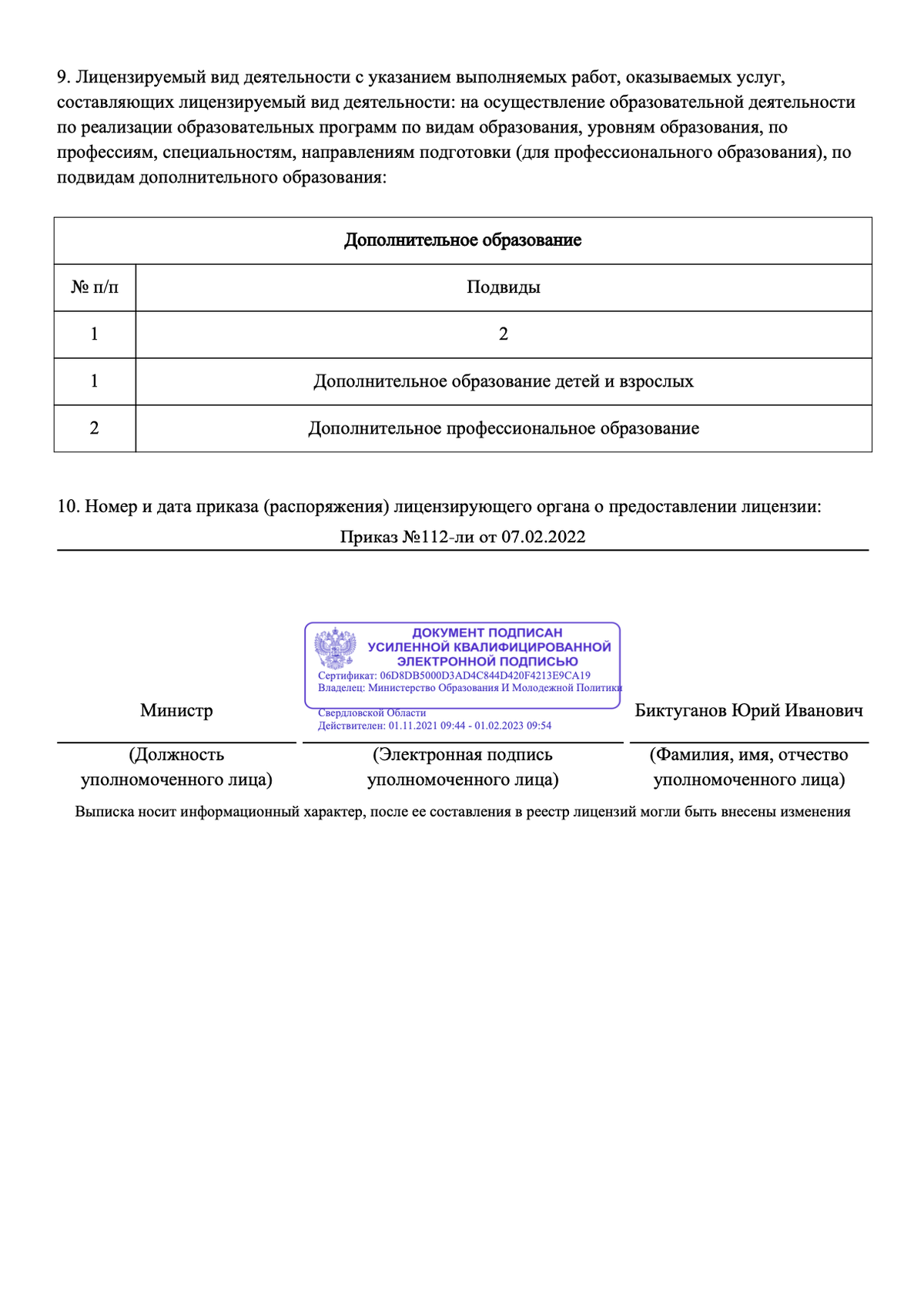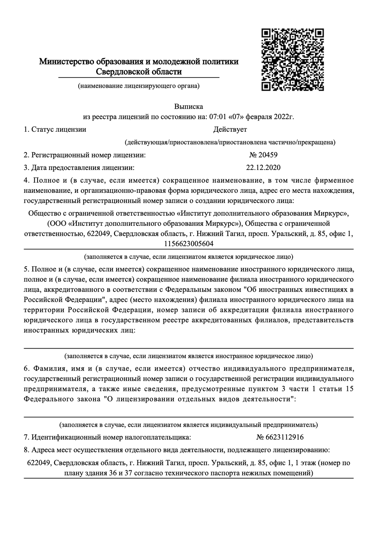 Образовательная лицензия №20459 от 22.12.2020 выдана Министерством образования и Молодежной политики по Свердловской области.